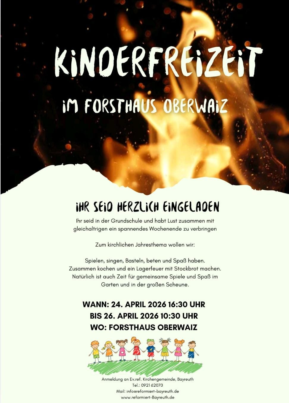 Vom 24. bis 26. April findet eine Kinderfreizeit für Kinder von 6 bis 10 Jahren in Oberwaiz statt. Der Flyer hierfür liegt im Gemeindehaus aus bzw. hängt H I E R an. Bitte meldet euch zeitnah im Gemeindebüro an!
